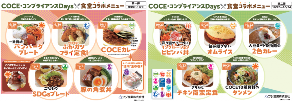 フジ産業は、豊田通商グループの一員です。このたび、豊田通商グループ全体で毎年この時期に、コンプライアンス 意識向上を目的として開催している 「COCE・コンプライアンスDays_2025」 に合わせ、一部事業所にて、コラボメニューを展開することとなりました。(※COCE:豊田通商グループのグローバル行動倫理規範)