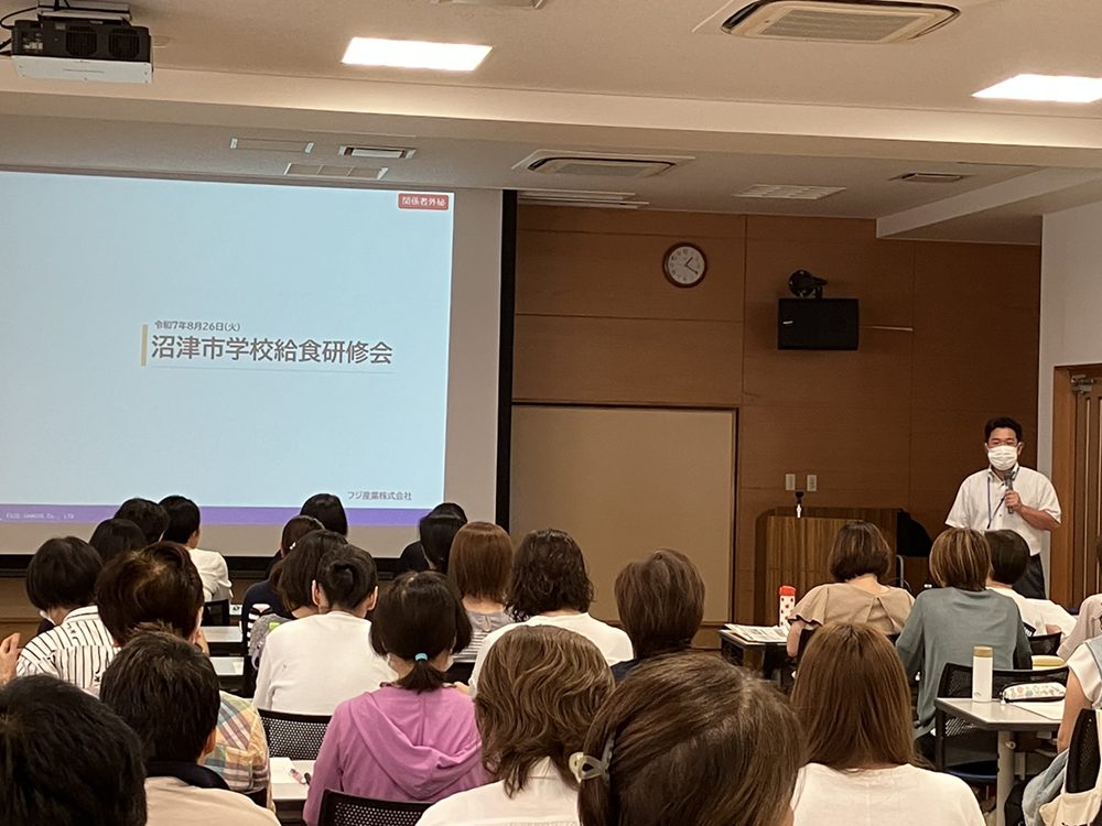 2025年8月26日、静岡県沼津市教育委員会が主催する、「学校給食職員夏季研修会」が行われ、フジ産業が講師を担当いたしました。この研修会は、沼津市が食の安全性は最優先の課題としており、毎年、調理場で働く職員を対象に、衛生管理に関する学びの場として毎年開催しているもので、今年のテーマは「転倒防止及び調理場ハザードマップ作りについて」でした。